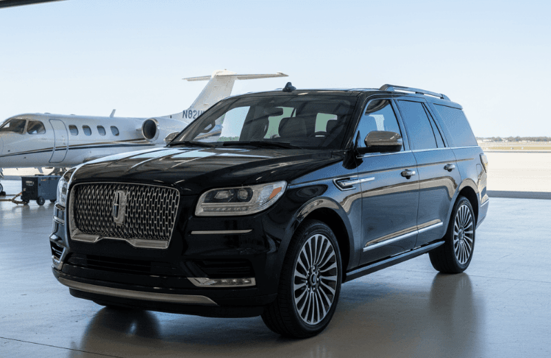 Options include luxury sedans, black SUVs like Escalade and Navigator, and Sprinter vans for group airport transportation.